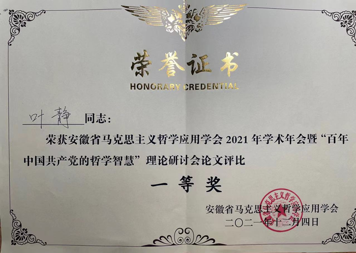 12月4日,安徽省马克思主义哲学应用学会2021年学术年会暨“百年中国共产党的哲学智慧”理论研讨会召开,威尼斯官网2019级马克思主义中国化研究专业叶静同学与其导师柳泽民教授合著论文《中国式现代化的历史逻辑与内在特质》在论文评比中荣获一等奖。
